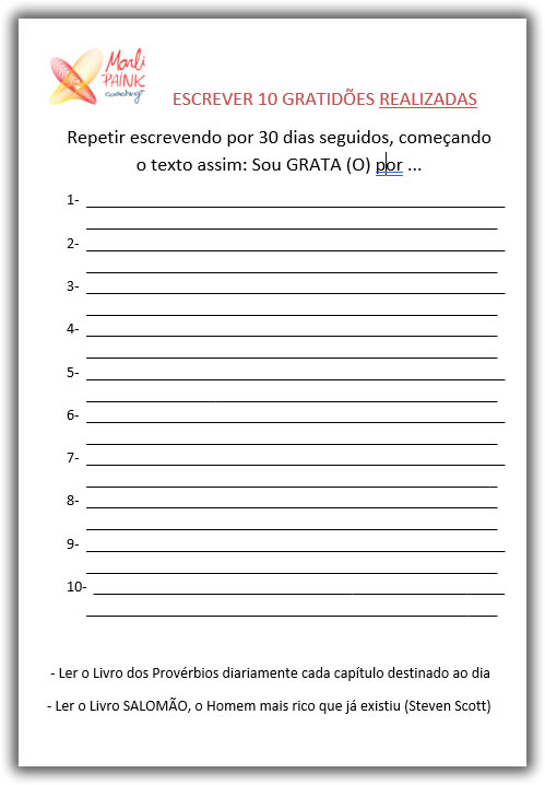 Ferramenta 10 Gratidões Novembro 29, 2020 Ferramentas 0 Comments Repetir escrevendo por 30 dias seguidos, começando o texto assim: Sou GRATA (O) por … Clique na imagem para fazer o download. ferramentagratidão Compartilhe isso Tweet Share Plus one Pin It Share Confira também Ferramenta Identificar Crenças – Aaron Beck Baixe agora essa ferramenta poderosa para identificar crenças (Fortalecedoras ou Limitantes) que trabalhamos nos processos… Ferramenta Como estou caminhando… jornada Faça sua anotação nesta ferramenta para identificar como está caminhando em sua jornada de transformação.… Ferramenta – As 5 linguagens do amor Quando aplico a ferramenta Roda da Vida, em que o coachee analisa cada uma das… Deixe um comentário Cancel comment replyO seu endereço de email não será publicado. Campos obrigatórios marcados com *Nome * Email * Site Comentário *